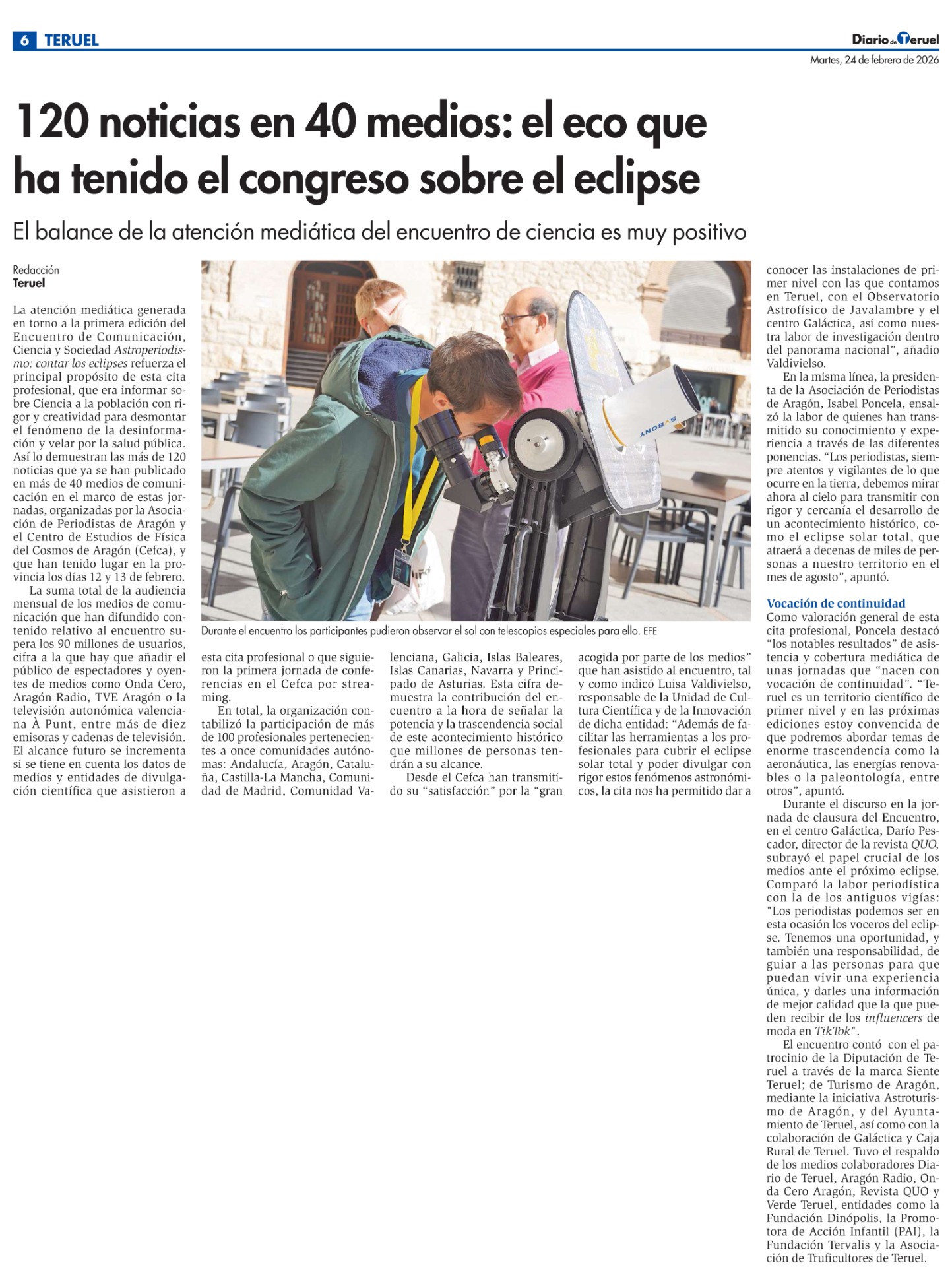 Como broche visual del año, una imagen del Sol tomada por Eduardo Riaza, responsable del proyecto, ha sido publicada en la Plaza de San Juan de Teruel. Esta acción forma parte de las actividades de preparación para los eclipses solares de 2026, 2027 y 2028, que podrán ser observados desde la península ibérica.