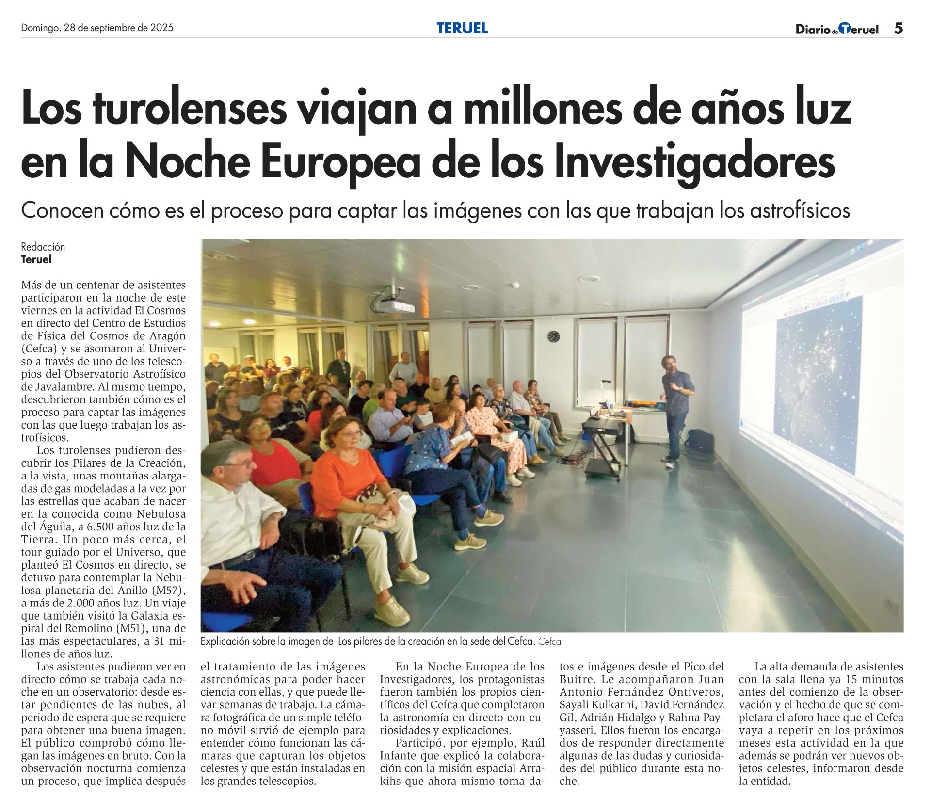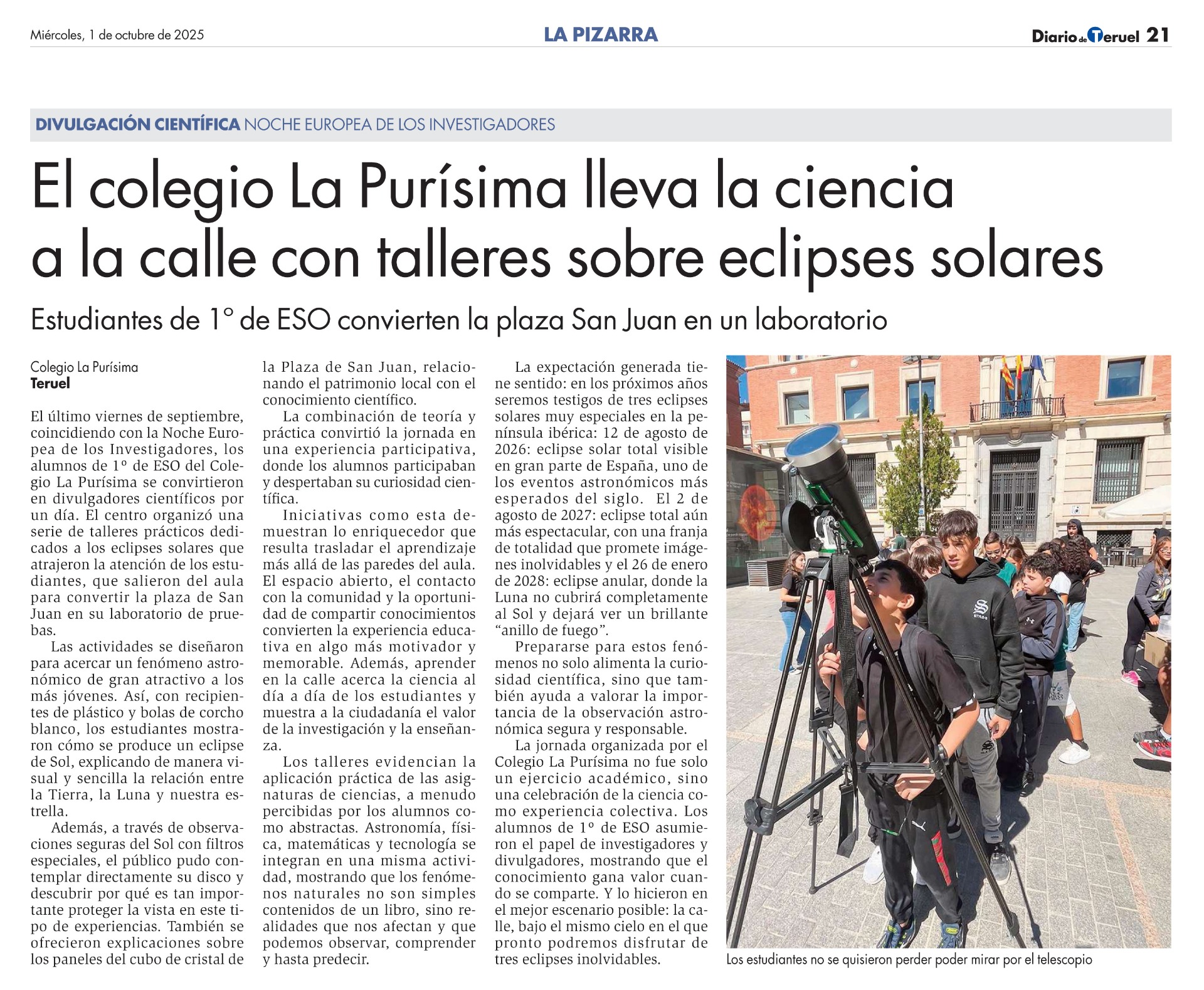Como broche visual del año, una imagen del Sol tomada por Eduardo Riaza, responsable del proyecto, ha sido publicada en la Plaza de San Juan de Teruel. Esta acción forma parte de las actividades de preparación para los eclipses solares de 2026, 2027 y 2028, que podrán ser observados desde la península ibérica.
