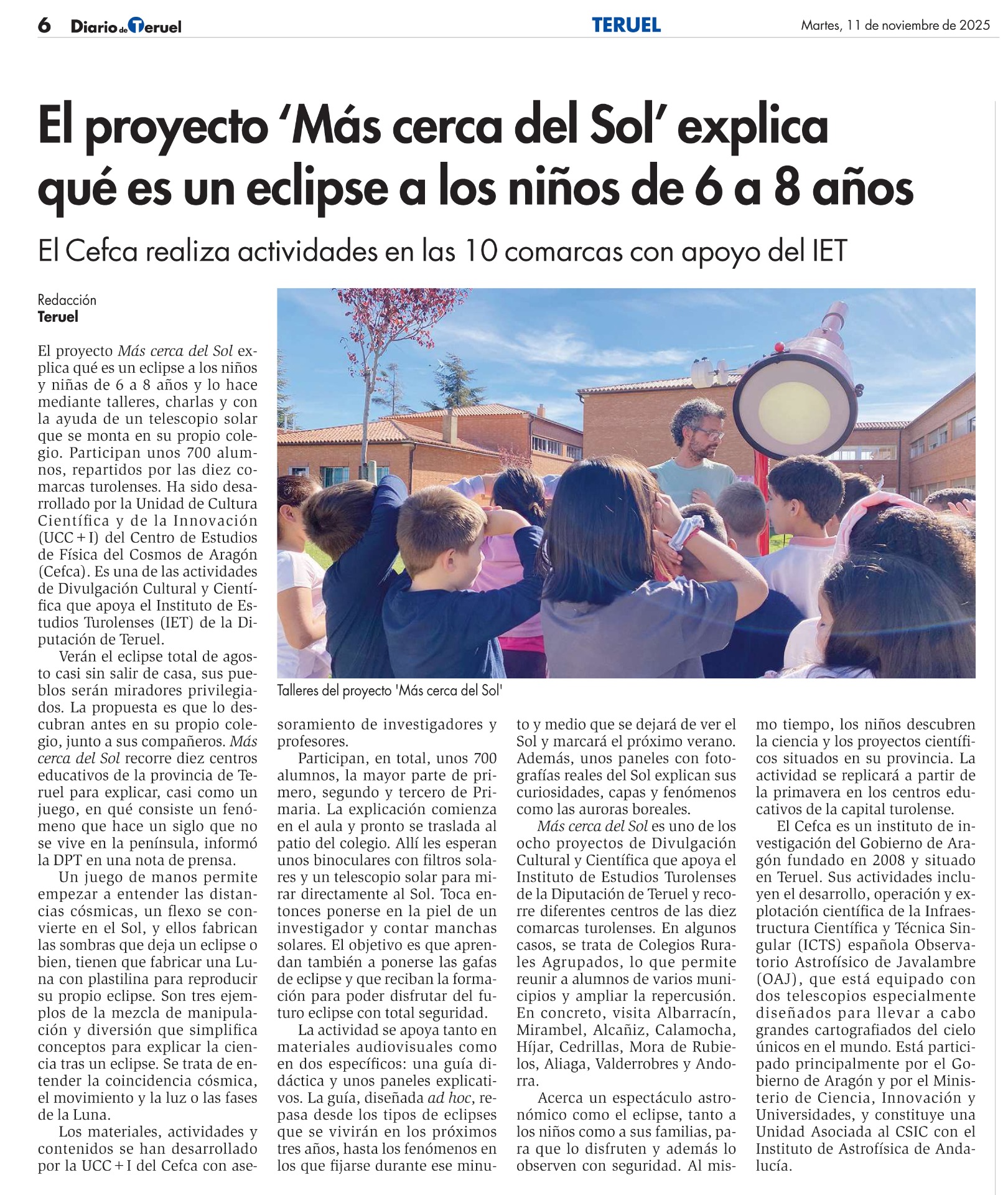 12 de noviembre de 2025: Talleres sobre los eclipses solares en los colegios de la provincia de Teruel