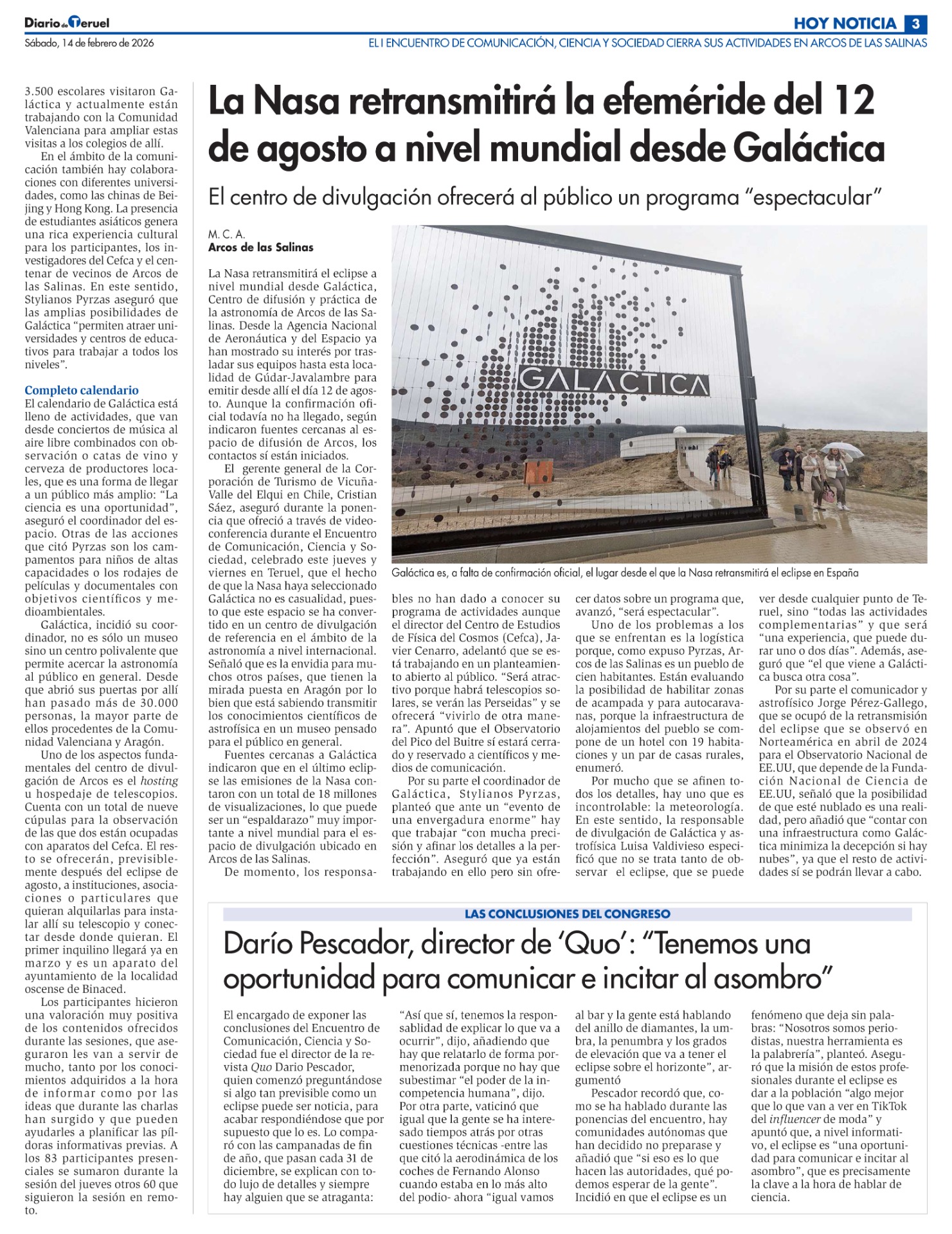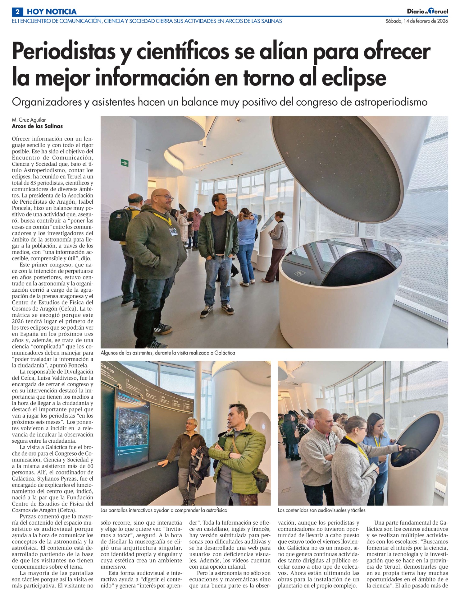 Como broche visual del año, una imagen del Sol tomada por Eduardo Riaza, responsable del proyecto, ha sido publicada en la Plaza de San Juan de Teruel. Esta acción forma parte de las actividades de preparación para los eclipses solares de 2026, 2027 y 2028, que podrán ser observados desde la península ibérica.